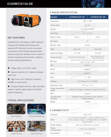 1.3MP 92fps SS 1/2.7" GigE Vision Global Shutter Camera iCt20M/CG13A-SE