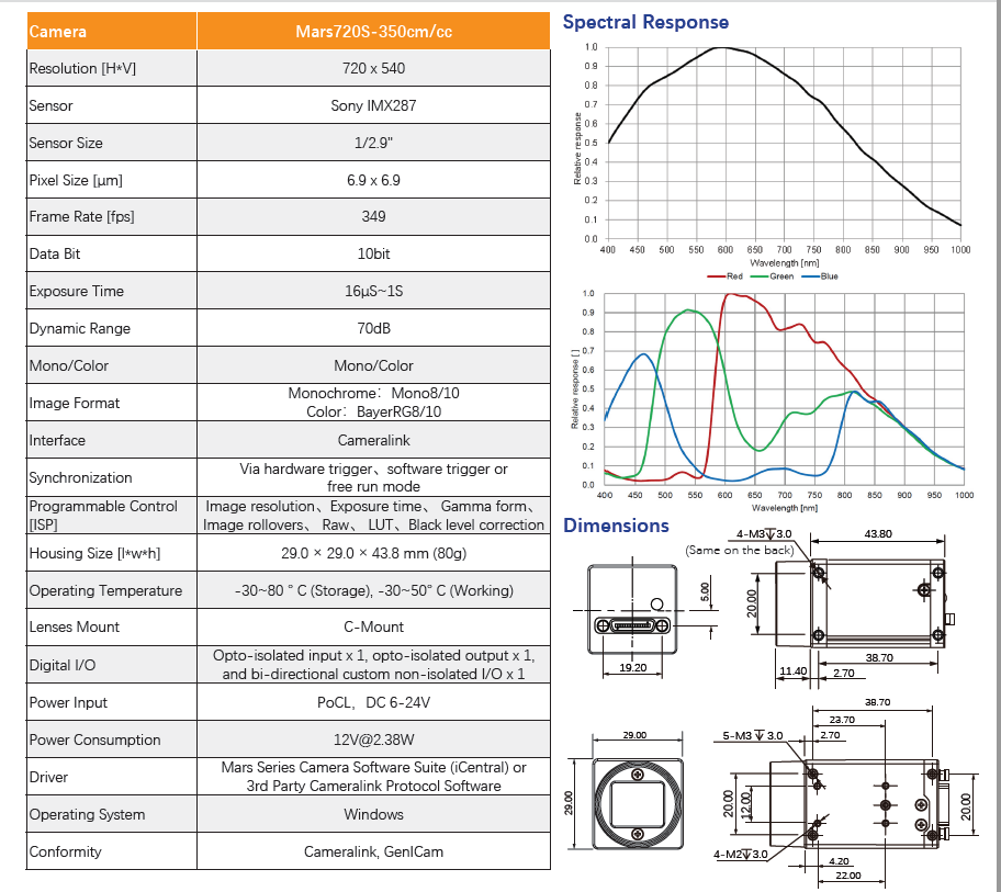 The Mars720S-350cm/cc is a compact, high-performance industrial camera designed for demanding machine vision applications. Featuring a high frame rate of up to 349 fps at 0.4 megapixels, it delivers exceptional image quality and reliability. Built with the Sony IMX287 sensor, this camera ensures excellent sensitivity, low noise, and stable performance even in challenging environments.