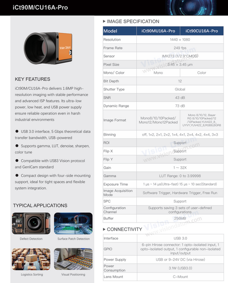 Caméra à obturateur global USB 3.0 250 FPS IMX273 1,6 MP 3,45 μm 1/2,9"