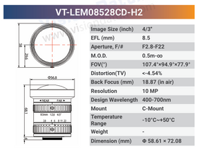 The VT-LEM-CD-H2 is a high-performance 4/3" C-mount fixed lens engineered for 10MP industrial cameras and precision machine vision systems. Optimized for the visible light spectrum (400–700nm), this lens delivers excellent image clarity, stable optical performance, and reliable accuracy in demanding inspection environments.